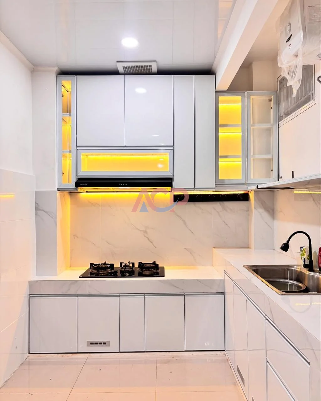 Kitchen set aluminium ACP putih menjadi pilihan favorit untuk dapur minimalis.
