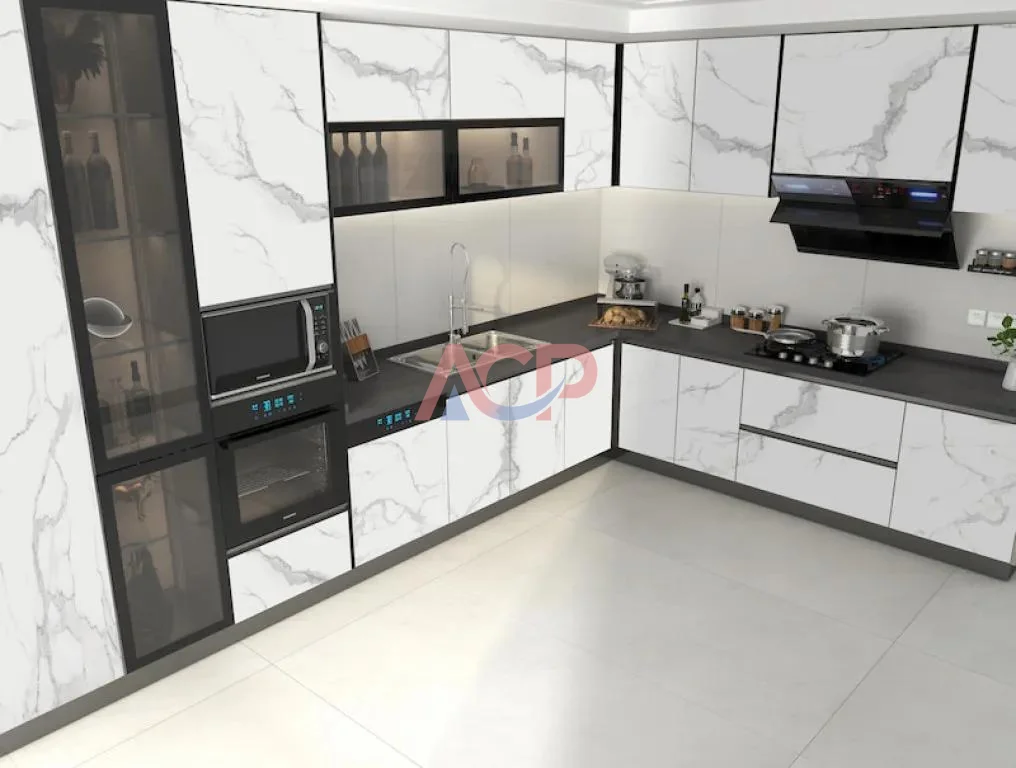 Jika kamu ingin tampilan dapur yang mewah, kitchen set ACP motif marmer bisa jadi pilihan terbaik.